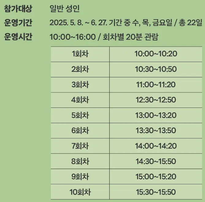 - 회당 정원 : 15명 (1인 1매 / 선착순 마감)